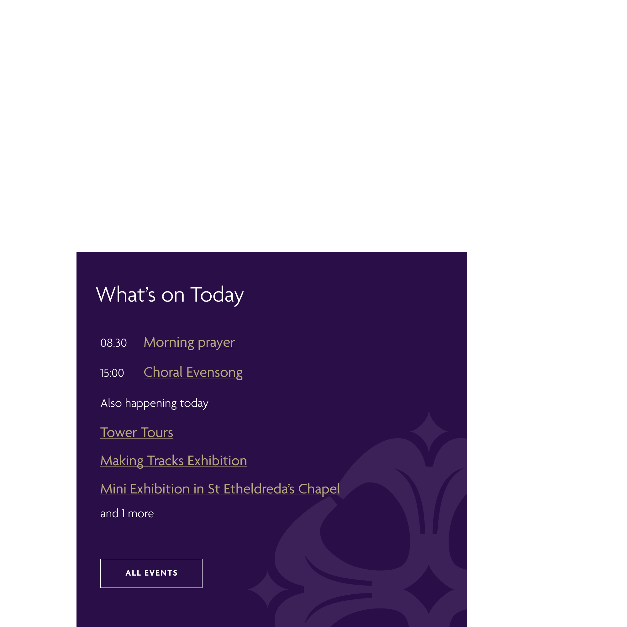 We created and implemented a “What’s On Today” widget at the top of the homepage, offering visitors today’s event overview. It dynamically retrieves pertinent information from the website’s event section, ensuring real-time updates for users.